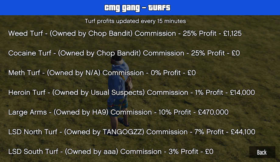 Within the turfs page, you can see the commission on a specific turf, and how much that gang has made from owning that turf, the turfs menu only gets updated every 15 minutes to prevent power-gaming.