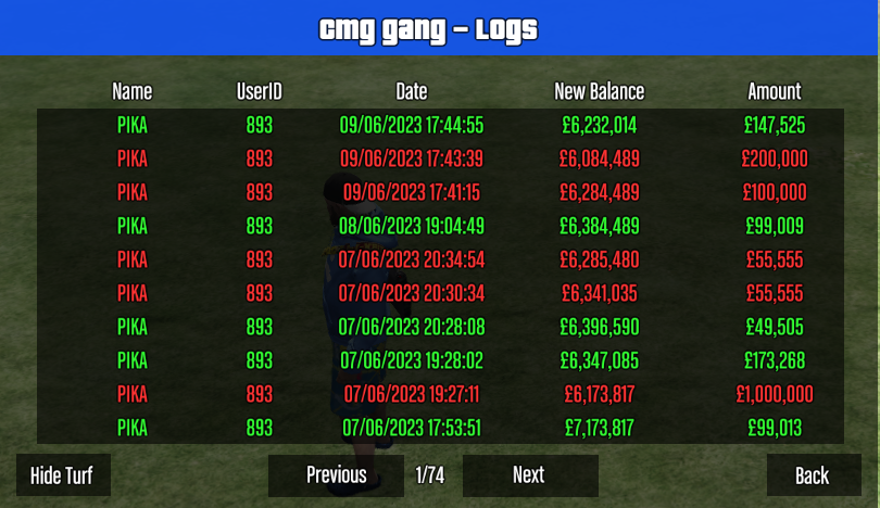 With the logs, it allows you to see all money that's been added / withdrawn from your gang funds. <mark style="color:red;">Red</mark> displays money withdrawn, and <mark style="color:green;">Green</mark> displays money deposited into the account.
